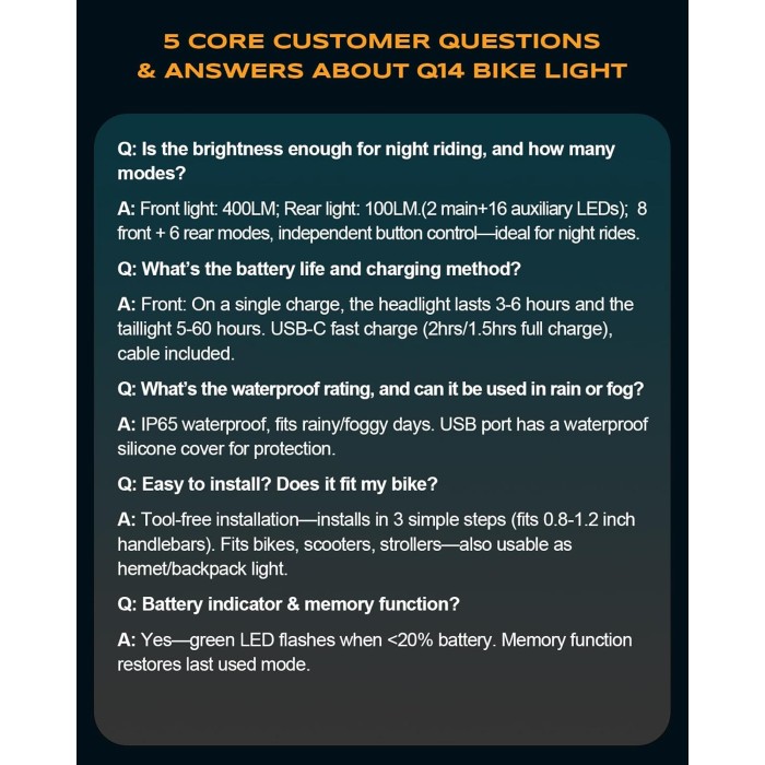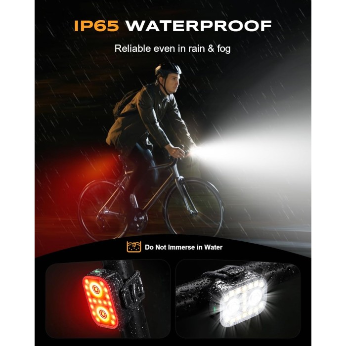 - IP65 Waterproof & High-Strength Construction: WOCBUY rechargeable bike lights boast IP65 waterproof rating and 1.5m drop-resistant structure. They provide stable illumination whether riding in heavy rain or rough mountain roads. The Type-C port features a sealed silicone design to prevent rainwater infiltration