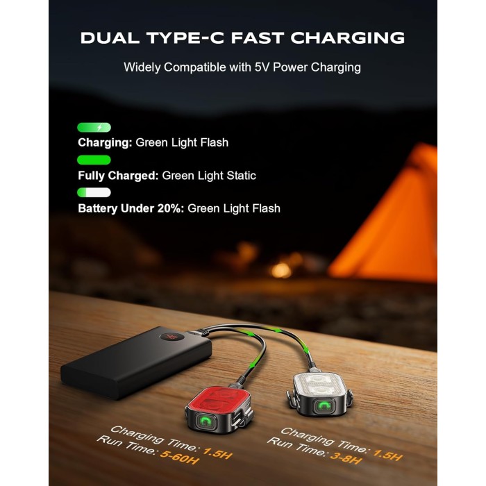 - Dual Type-C Charging & Long Battery Life: The dual-port Type-C cable fully charges both light for bike in 1-2 hours. On a single charge, the headlight lasts 3-6 hours and the taillight 5-60 hours. A smart battery indicator flashes green when power is below 20%, reminding you to recharge in time
