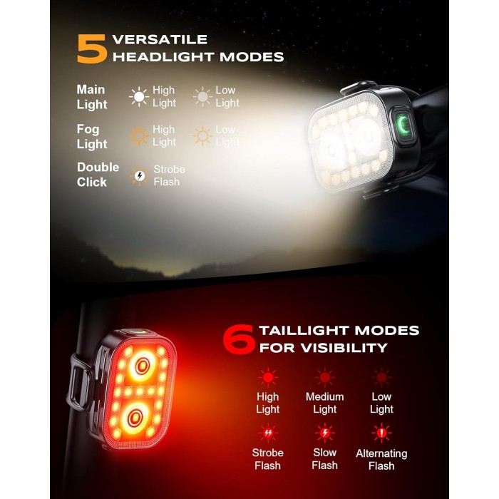 - 5+6 Lighting Modes + Daytime Running Lights: The headlight offers 5 lighting modes and the taillight 6, both with flash warning and mode memory functions. Featuring 2 large main lights plus 17 surrounding daytime running lights, they enhance bicycle lights front and rear penetration in low-visibility rain or fog, ensuring your riding safety